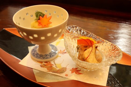 松茸、銀杏、海老つみれ、百合根、三つ葉、橙立