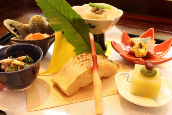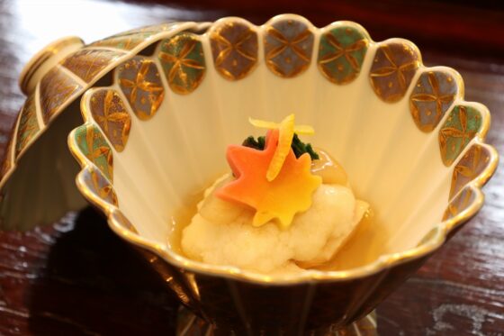 金目鯛、椎茸、慈姑、春菊、もみじ麩、柚子、美味餡
