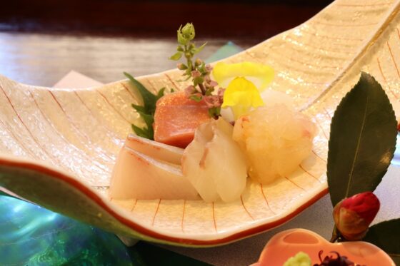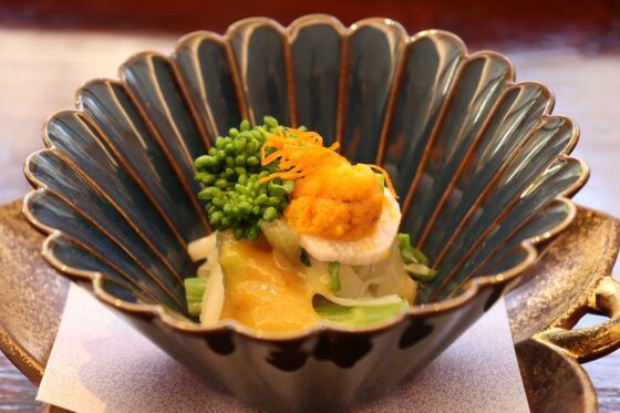 糸雲丹、白身魚昆布〆、長芋梅風味