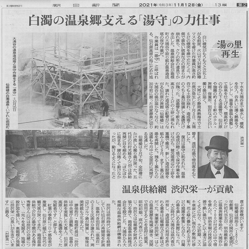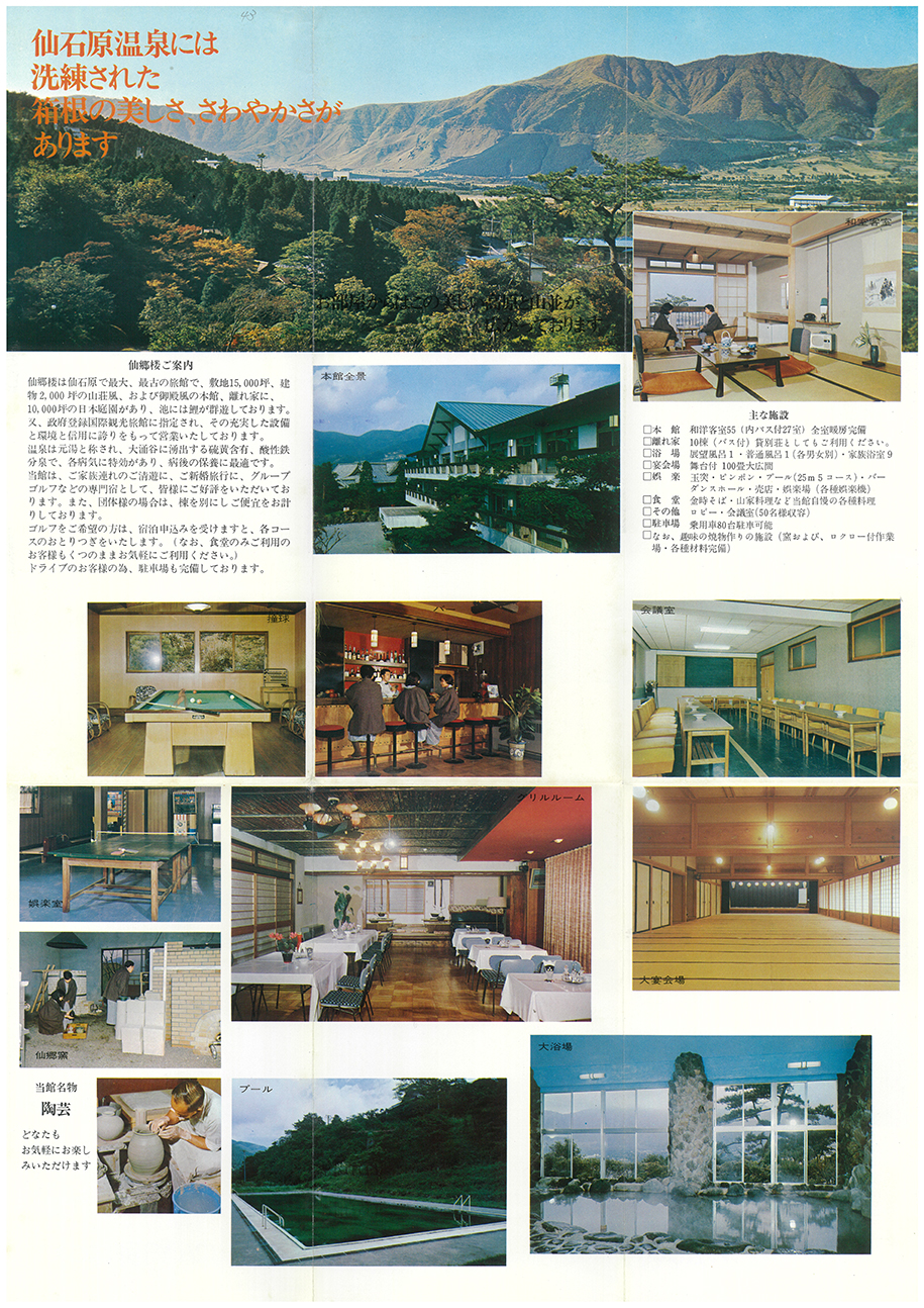 その後私共仙郷楼を含むいくつかの旅館・箱根登山鉄道㈱など当時大涌谷に温泉権を所有していた人びとにより大涌谷からの湯引管が共同出資され、さらに、渋沢栄一氏を始めとした渋沢・三井・益田の三家、それに大倉組代表者等が発起人となり現在仙石原・強羅エリアに温泉を供給している「箱根温泉供給㈱」が設立されました。