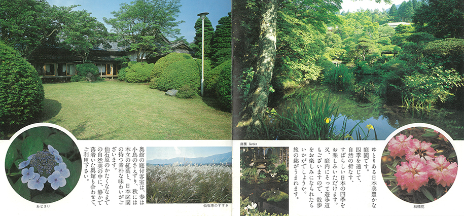 当館の前面には箱根外輪山がひろがり、緑濃く、裏山は秋には紅葉が美しく、敷地1万5千坪にはつつじ、しゃくなげ、ふじあるいはマメザクラなど数々の花々が季節ごとに咲き乱れます。